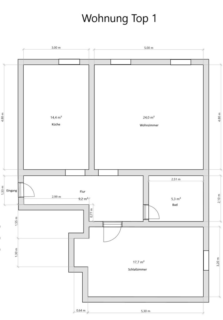 Wohnzimmer, Küche, Schlafzimmer, Bad und ein Kellerabteil.